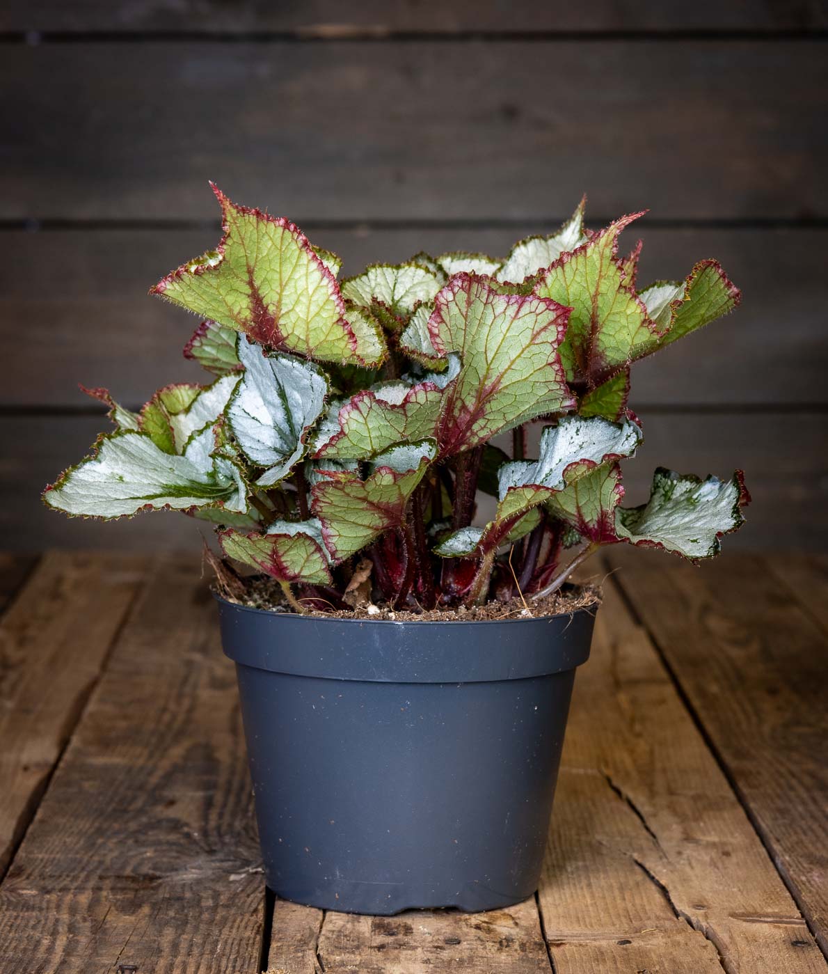 Hopeanvihreät lehdet ja viininpunaiset lehtisuonet hurmaavat tässä näyttävässä kuningasbegoniassa.