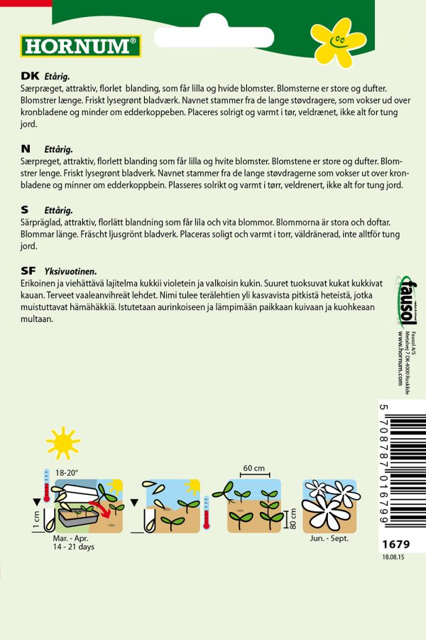 Yksivuotinen. Erikoinen ja viehättävä lajitelma kukkii violetein ja valkoisin kukin. Suuret tuoksuvat kukat kukkivat kauan. Terveet vaaleanvihreät lehdet. Nimi tulee terälehtien yli kasvavista pitkistä heteistä, jotka muistuttavat hämähäkkiä. Istutetaan aurinkoiseen ja lämpimään paikkaan kuivaan ja kuohkeaan multaan. Kylvön jälkeen maata on pidettävä kosteana siihen asti kunnes itäminen alkaa.