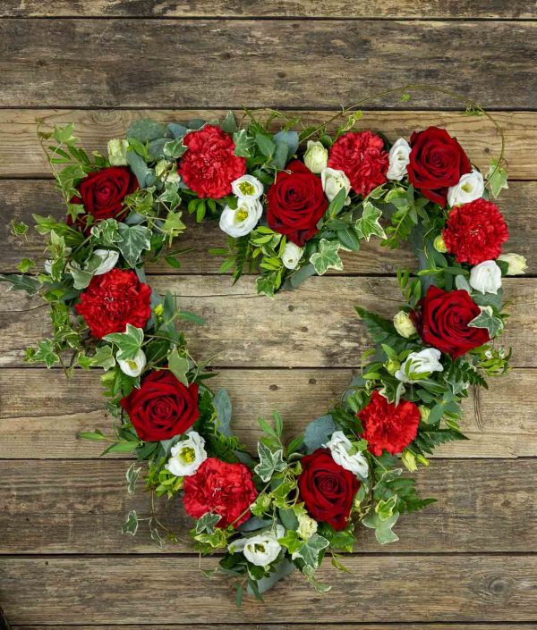 Sydämen mallinen muotosidontatyö on kaunis vaihtoehto perinteiselle hautavihkolle. Tässä sydämessä on käytetty pääkukkana punaisia ruusuja ja lisäksi muita tyyliin sopivia valkoisia kukkia ja vihreitä.