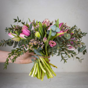 Hempeän värisistä tulppaaneista sidottu kimppu, johon sidottu rennosti erilaisia eucalyptuksia.