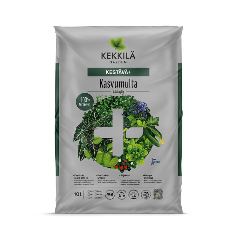 Kekkilä Kasvumulta Kestävä+ on ympäristöä säästävistä uusiutuvista ja kestävistä raaka-aineista valmistettu turpeeton multa. Multa on käyttövalmis ja sopii kaikille kasveille kotona ja puutarhassa.