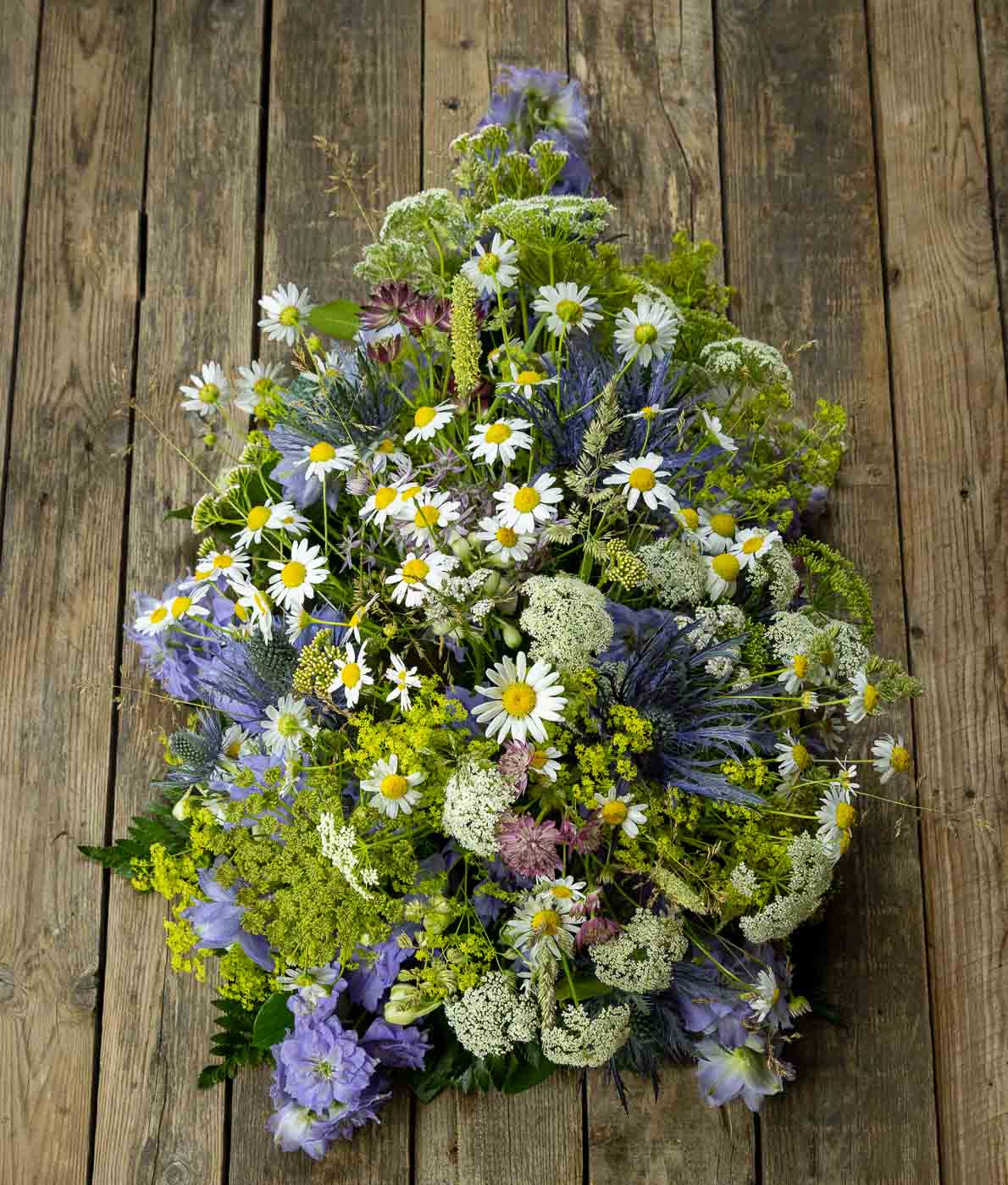 Niittytyylinen surulaite, jossa on käytetty pääsääntöisesti luonnonmateriaaleja, erilaisia heiniä ja päivänkakkaroita.