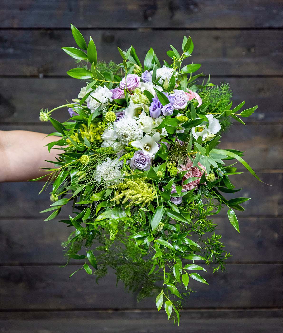 Pääkukkana kimpussa toimii suurikukkainen ruusu, jota löytyy laventelin ja vaaleanpunaisen sävyissä. Valkoista freesiaa, törmäkukkaa, neilikkaa, ja preerianeustomaa on kimpussa myös runsaasti. Vaaleanvihreänä lisänä kimpussa on myös kukonharjaa, ja keventämässä kokonaisuutta hirssiheinää.