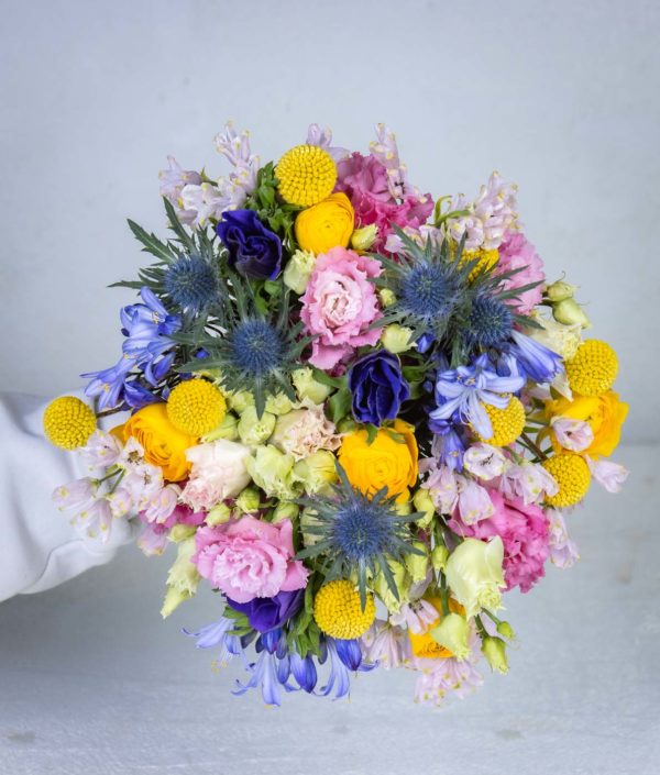 Pirteä iloittelu raikkaista sävyistä. Matala ja pyöreä kimppu joka on sidottu minimaalisilla vihreillä. Kimpussa on yhdistelty reilusti erilaisia sesongin kukkia kuin myös ajattomampia kukkia.