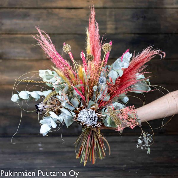 Erilaisista kuivakukista kasattu näyttävä kimppu. Kuivakukat kestävät pitkään hyvänä.