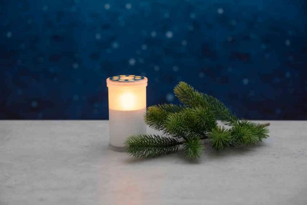 Finnlumor LED-hautakynttilä hämäräkytkimellä ja 6h ajastintoiminnolla. Paloaika 1-2kk riippuen paristoista ja olosuhteista.