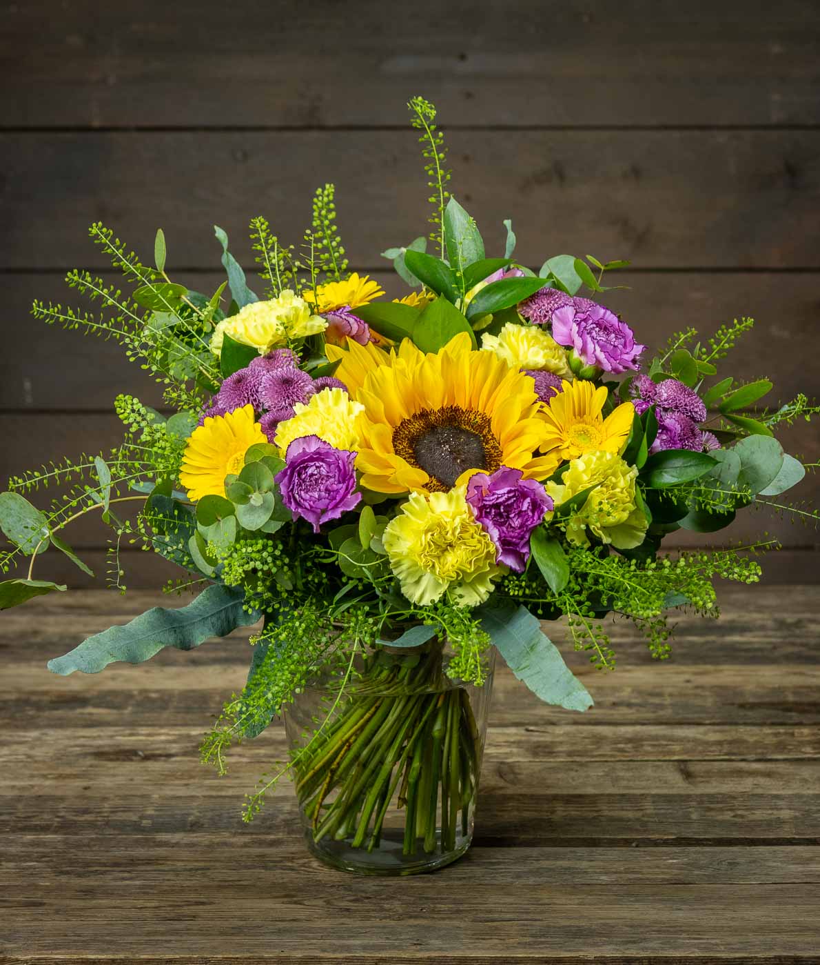 Upea ja näyttävä loppukesän kimppu, jonka kruunujalokivenä toimii suuret auringonkukat. Veikeyttä tähän matalahkoon kimppuun tuo raikkaanvihreät taskuruohot.