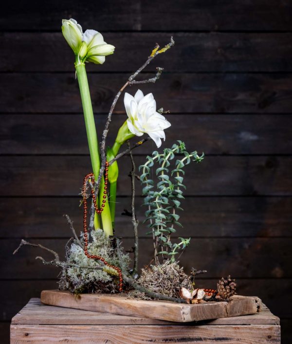 Tyylikäs asetelma mehikasveista ja ilmakasveista. Trendikäs peikonpähkinän oksa viimeistelemässä istutusta. Kasvit ovat istutettu koristeelliseen kullattuun suojaruukkuun.
