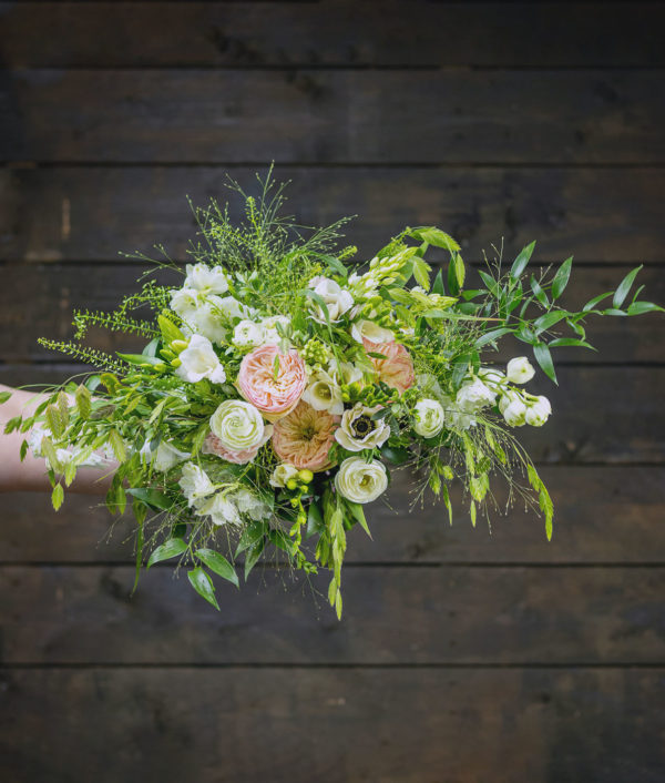 Kesäniittymäinen boheemi rennosti sidottu morsiuskimppu. Kimpussa on käytetty kaunista vaaleanpunaista puutarharuusua sekä lisäksi runsaasti erilaisia pieniä kukkia. Malliltaan tämä morsiuskimppu on pitkänmallinen ja sivuille rönsyävä.