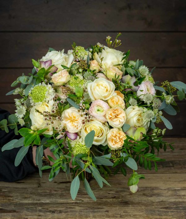 Käytettävät kukat koostuvat suurikukkaisesta valkoisesta ruususta, vaaleasta oranssista puutarharuususta, valkoisesta isotähtiputkesta, vaaleanpunaisesta jaloleinikistä, ja valkoisesta törmäkukasta. Metsäistä tunnelmaa on tuomassa valkoinen vahakukka, kaksivärinen jouluruusu, sekä tummanvihreä pistaasi. Harmoniaa kokonaisuuteen on tuomassa harmahtava kapealehtinen eucalyptuksen marjainen oksa.