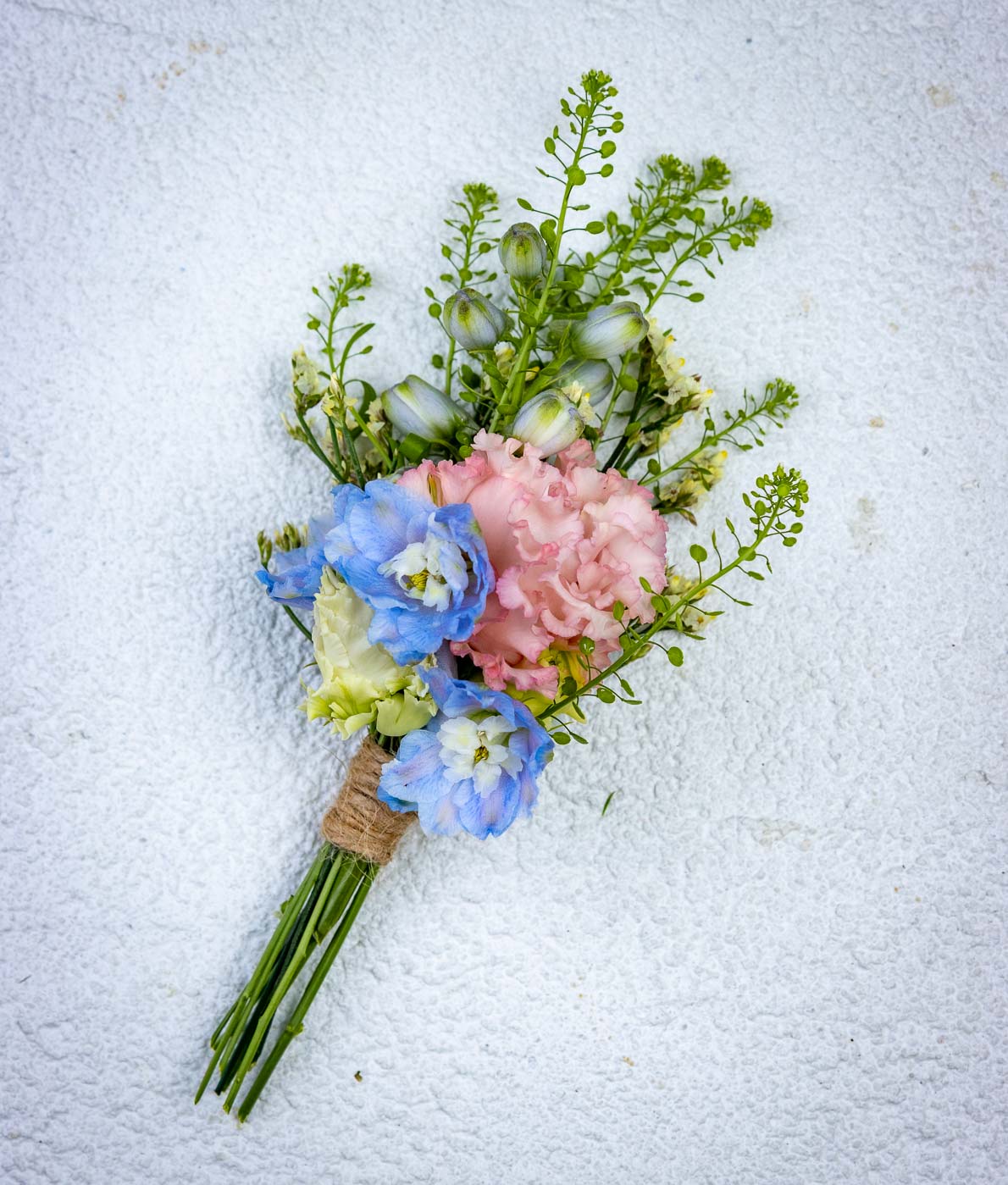 Pastelliunelma-viehe on täydellinen valinta romanttiseen ja herkkään juhlatyyliin. Siinä yhdistyvät silkkinen vaaleanpunainen eustoma ja taivaansiniset kukkien nuput, jotka luovat yhdessä raikkaan kokonaisuuden.