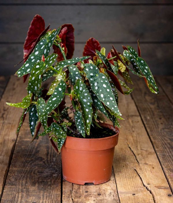 Tuo kotiisi ripaus leikkisää eleganssia tällä upealla Pilkkubegonia Wightii -kasvilla! Sen enkelinsiipeä muistuttavat, oliivinvihreät lehdet hurmaavat hopeisilla pilkuillaan ja punaisella alapinnallaan. Tämä begonia ei ole ainoastaan näyttävä ilmestys, vaan myös suhteellisen helppohoitoinen lisä viherkasvikokoelmaasi.