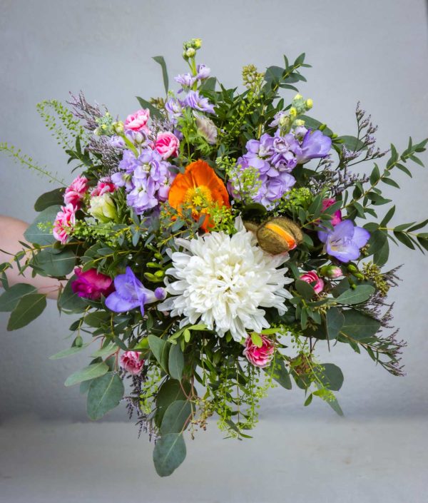 Huomioithan sesongin: Elävät kukat vaihtelevat vuodenaikojen mukaan. Jos tiettyä kukkaa ei ole saatavilla, korvaamme sen vastaavalla, yhtä kauniilla kukalla säilyttäen kimpun tyylin ja värimaailman.