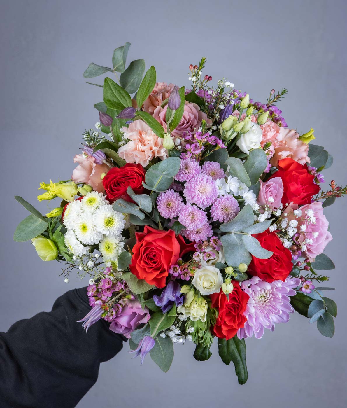 Kimpussa pääkukkana esiintyy suurikukkainen punainen ruusu, ja siihen on yhdistetty mm. neilikkaa, krysanteemia, ikiviuhkoa ja muita kauden kukkia. Kimpun kukat saattavat poiketa esimerkkikimpussa näkyvistä. Maljakko ei sisälly hintaan.