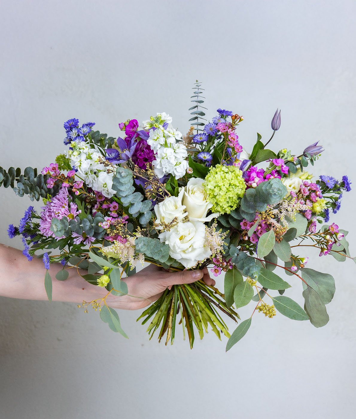 Avautuva ovaalinmuotoinen kukkakimppu rönsyävillä vihreillä. Värimaailma teoksessa on herkkä vaaleanpunaisin ja valkein sävyineen, mutta vivahdetta antaa huurteinen sininen. Kukkina toimii monipuolinen sesongin kirjo erilaisia kukkia. Harmahtava eucaluptus viimeistelee asetelmaa.