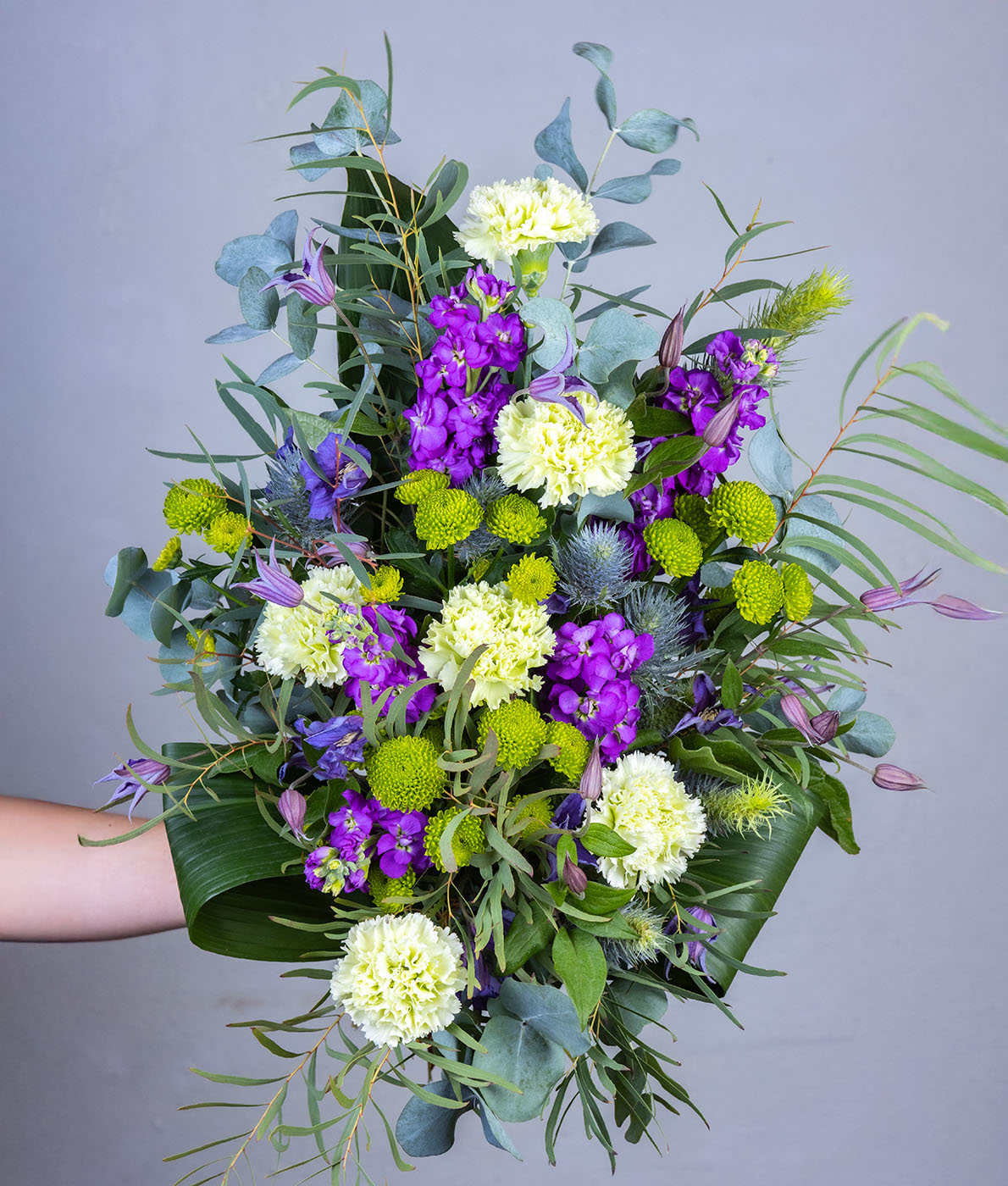 Surukimpussa pääkukkina on käytetty leukoijaa sekä neilikkaa. Lisäkukkina kimpussa on violettia kärhöä, piikkiputkea sekä oksakrysanteemia.