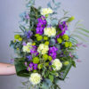 Rönsyävä niittymäinen hautakimppu hautajaisiin tai uurnanlaskutilaisuuteen. Kimpussa on käytetty erilaisia kukkia lilan ja sinisen sävyissä. Hempeyttä kimppuun tuo muutama vaaleanpunasävytteinen ruusu.