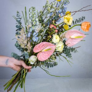 Huomioithan sesongin: Elävät kukat vaihtelevat vuodenaikojen mukaan. Jos tiettyä kukkaa ei ole saatavilla, korvaamme sen vastaavalla, yhtä kauniilla kukalla säilyttäen kimpun tyylin ja värimaailman.