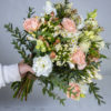 Matala pyöreä valkoinen osanottokimppu surun hetkellä omaisille. Tässä kimpussa on käytetty runsaasti erilaisia valkoisia kukkia, kuten esimerkiksi ruusua, preeriaeustomaa, freesiaa, neilikkaa tädykettä.