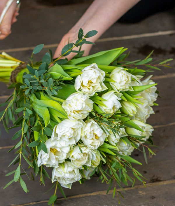 Runsaalla ja rönsyävällä tyylillä sidottu kimppu tulppaaneista. Tässä kimpussa käytetään kauden vihreitä tulppaanien lisäksi.