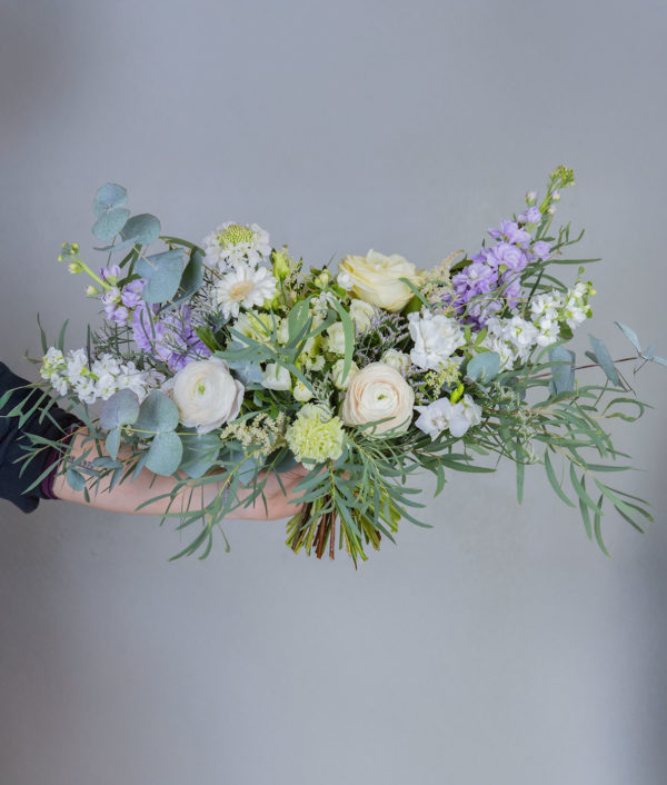 Puutarhamainen kimppu rönsyävällä ja runsaalla tyylillä sidottuna. Tämän kimppu koostuu herkistä pastellisista sävyistä, näitä viimeistelemässä on erilaiset eucalyptuksen oksat. Kukkina on käytetty monipuolisesti erilaisia lajeja ja muotoja.